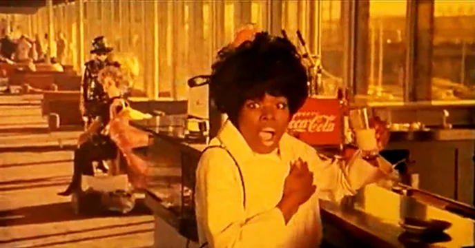 Toby Dammit The expression on the face signifies documentary while the background is clearly staged - even the Coca Cola logo behind the woman is contradicted by her incongruous glass of milk. - a world where everything finds its contradiction, its negation on the spot.
