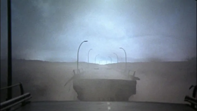 Toby drives like mad through empty highways as if daring an accident to happen. The crash comes against a barricade of oil drums and construction equipment. There is a shot of a tire spinning that is consciously awkward, accomplished as before, by zooming and tracking at different rhythms. Toby gets out of the car and starts to walk down a very modern highway with steel guard rails - but he appears to be in the middle of a deserted landscape. Suddenly Nino Rota’s insistent music abruptly stops. There is a heavy fog and behind the fog there are only trees and mountains. Because it is so difficult to see Toby walks into a discarded and empty oil drum lying in the middle of the road and he kicks it away - and the drum rolls into a chasm. We don't see it happen but infer it from the sound. After a few seconds we hear a very distant collision as the drum crashes at the bottom of an abyss. From the time lapse between the drum's stopping its roll and the crash we infer that it is a deep space - enough to be fatal. Only upon this realization do we see close-up of Toby smiling. He looks up and finally sees the collapsed bridge between layers of fog, and on the other side of the abyss he sees the little girl from the 19th century with her white ball. He shouts: