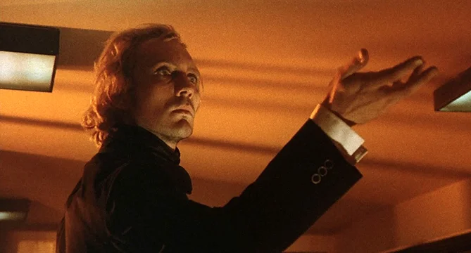 In an alcoholic stupor Toby Dammit rides in a limousine at dusk taking him from the airport to Rome yet the glimpses of the city that passes before him - and that we see through his point-of-view - through the car windows are from various times of the day that do not match the interior shots. The most astonishing of these sequences is of a Catholic procession in mid-day in which an effigy of the crucifixion passes before a concrete and glass modernist building – the warm gold and red of the theatrically baroque statue contrasting with the sleek grid of the modernist tower– the two kinds of power – secular and religious - meet and the statue of Christ seems to dance in front of the building turning it into a backdrop to the Passion. Significantly Toby barely notices the effigy which seems to offer him (an English Protestant) both a greeting and a warning. The car comes to a stop during a traffic jam and a gypsy woman comes to read his palm. On seeing the lines in his palm she closes his hand refusing to read his fate – Toby turns his closed hand into a fist and laughs maniacally as if the closed hand held a precious secret. In the limousine he sits between a priest, who is the producer of the film Toby will make and a woman who is his translator who explains the film he is to make in a humorously fake upbeat monotone voice: